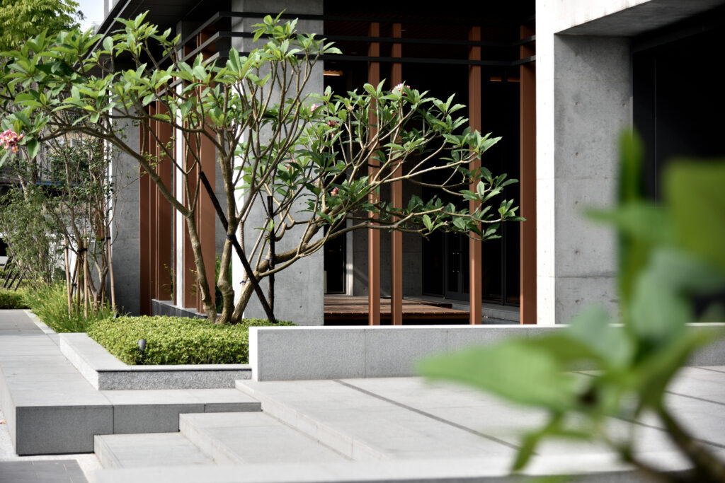 透過大面積的謙退空間與植坡規劃,