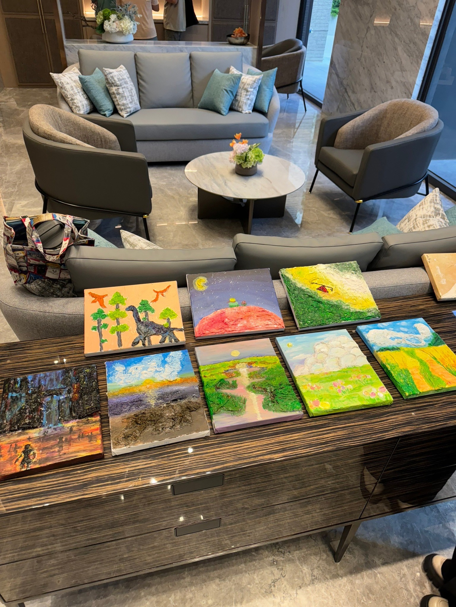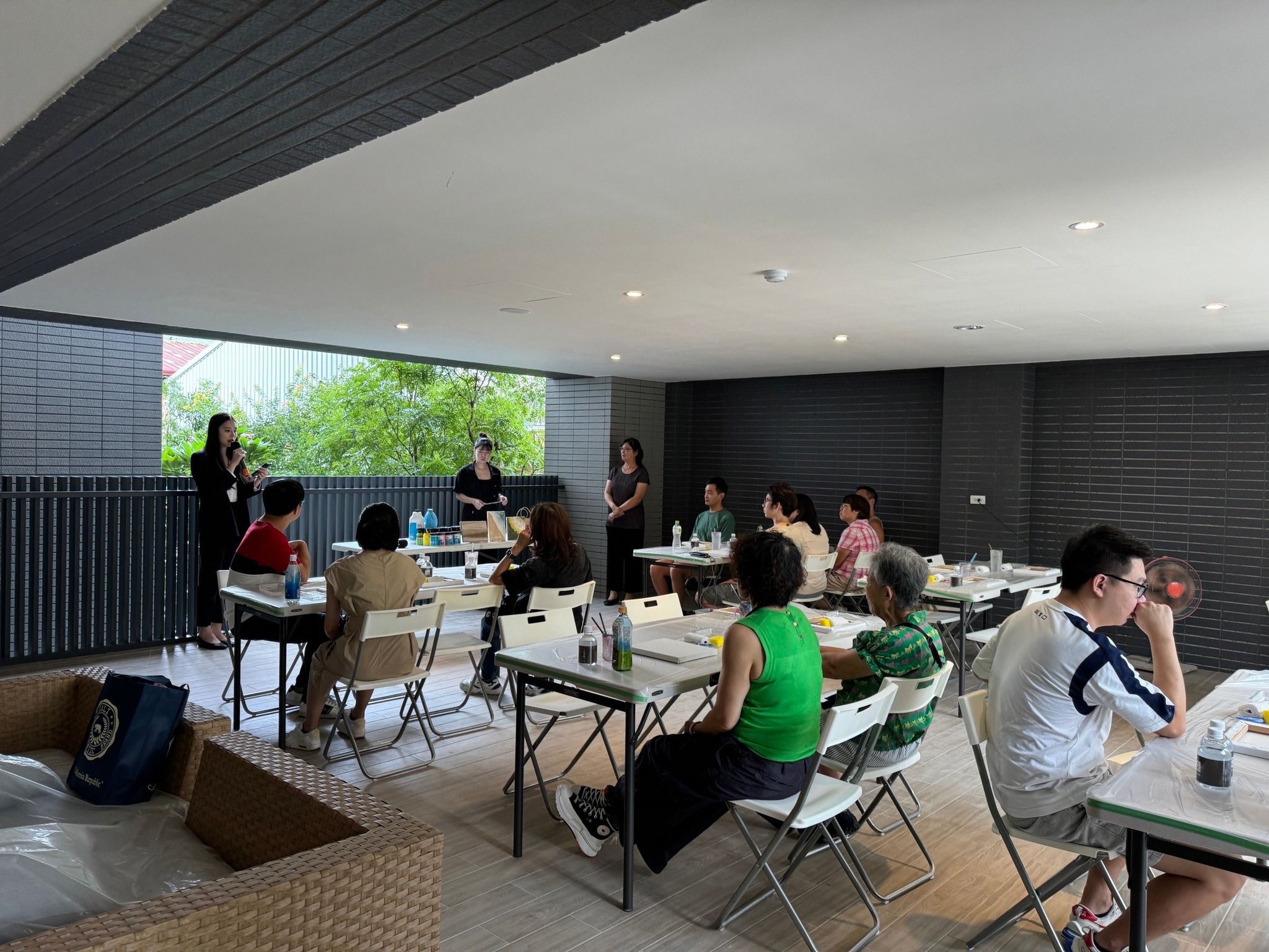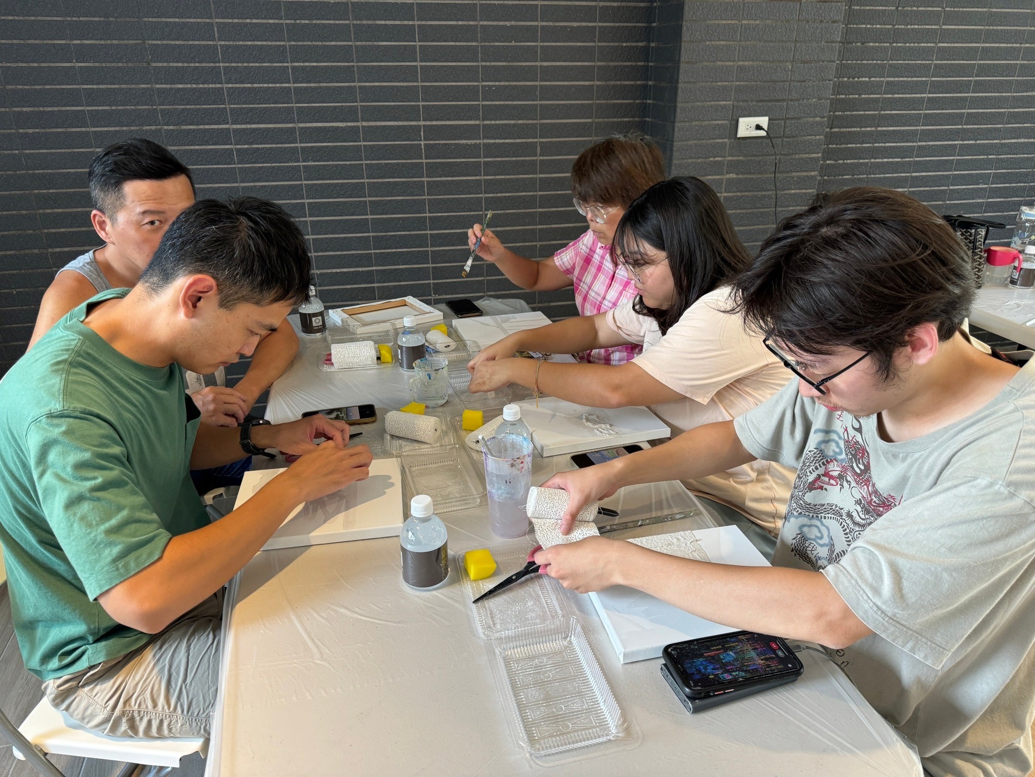 課程現場,每一張畫布前都坐著一位專注的創作者。石膏畫迷人之處在於它的「不確定性」與「層次感」,住戶們手持畫刀,在老師的技巧指導下,有人描繪山脈的起伏,有人模擬波浪的輕柔,也有人創造出充滿現代感的極簡紋理。活動過程中,大家沉浸在專注的靜謐裡,透過指尖的力度調整,每一道刮痕、每一處留白,都映照出個人對美的詮釋。這份對細節的專注與耐力,讓參與者深刻體會到:美,源自於對生活的細膩觀察與耐心的雕琢。